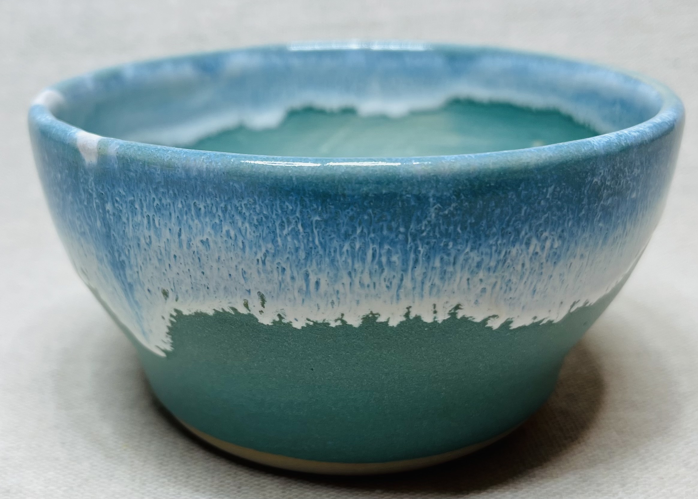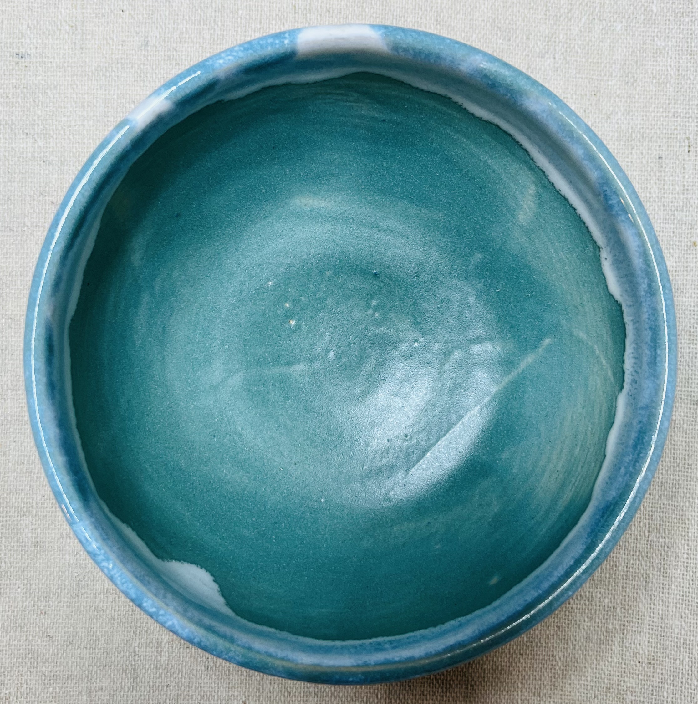 Ce bol bleu turquoise, traversé de coulures blanches, m’a immédiatement évoqué la neige en montagne, comme un paysage apparu au fil de la cuisson.