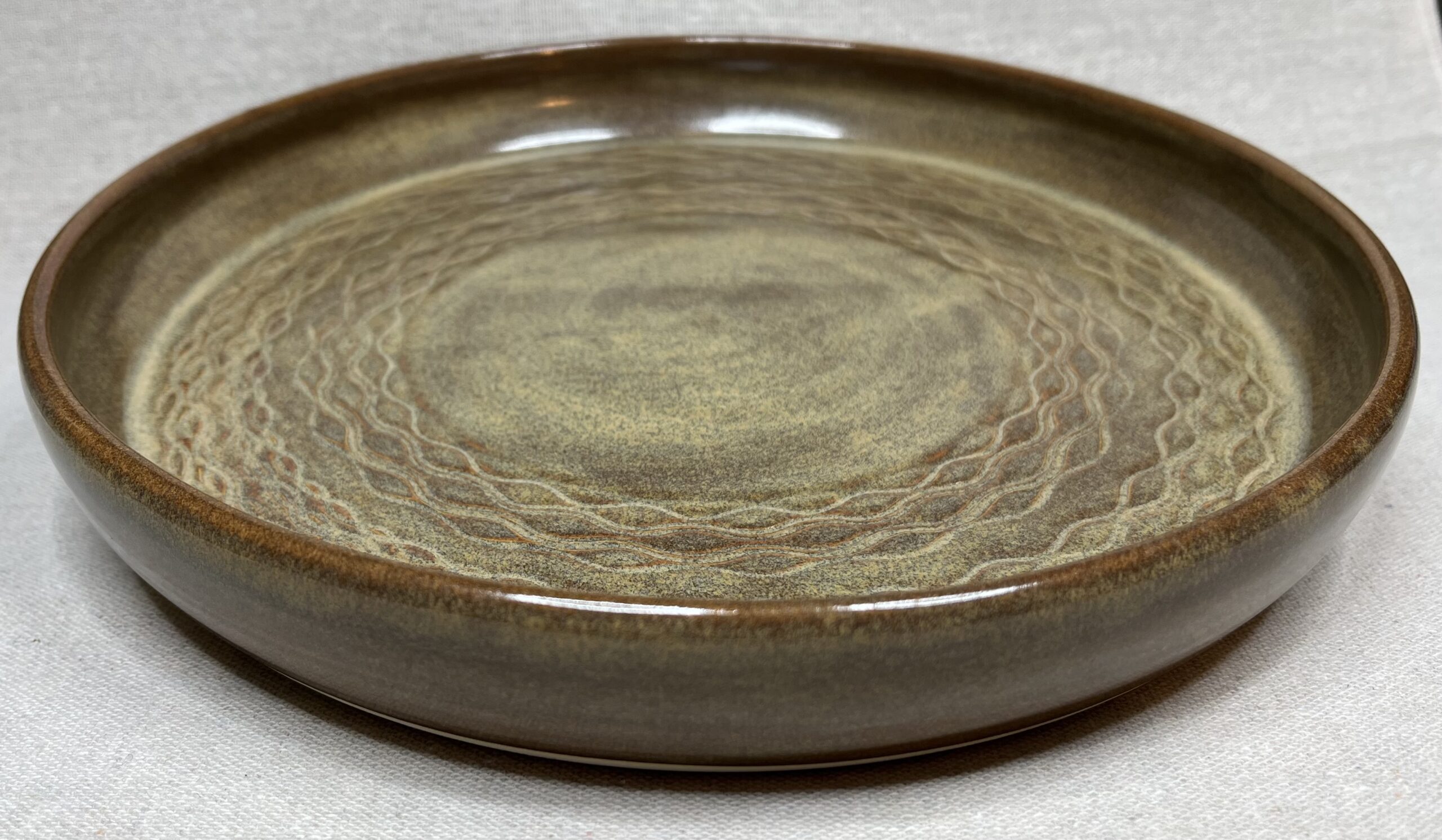 Ce plateau se distingue par sa finition chaleureuse aux tons bruns et ocres, rappelant la terre naturelle. Les stries ondulantes qui ornent sa surface créent un jeu subtil de textures et de lumière, évoquant des motifs organiques ou le mouvement délicat de l’eau. Le motif témoigne du savoir-faire artisanal et de l’attention portée à la matière, offrant à la fois beauté et fonctionnalité.