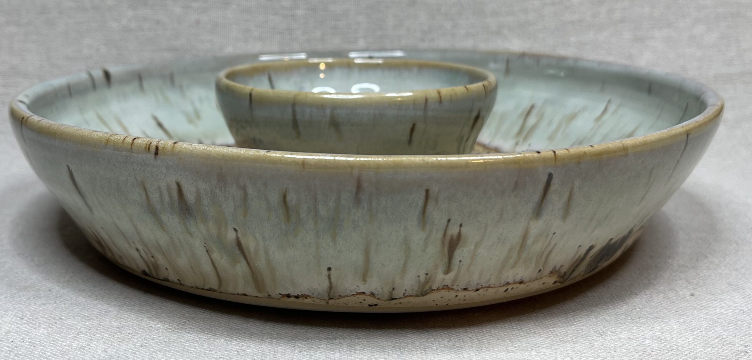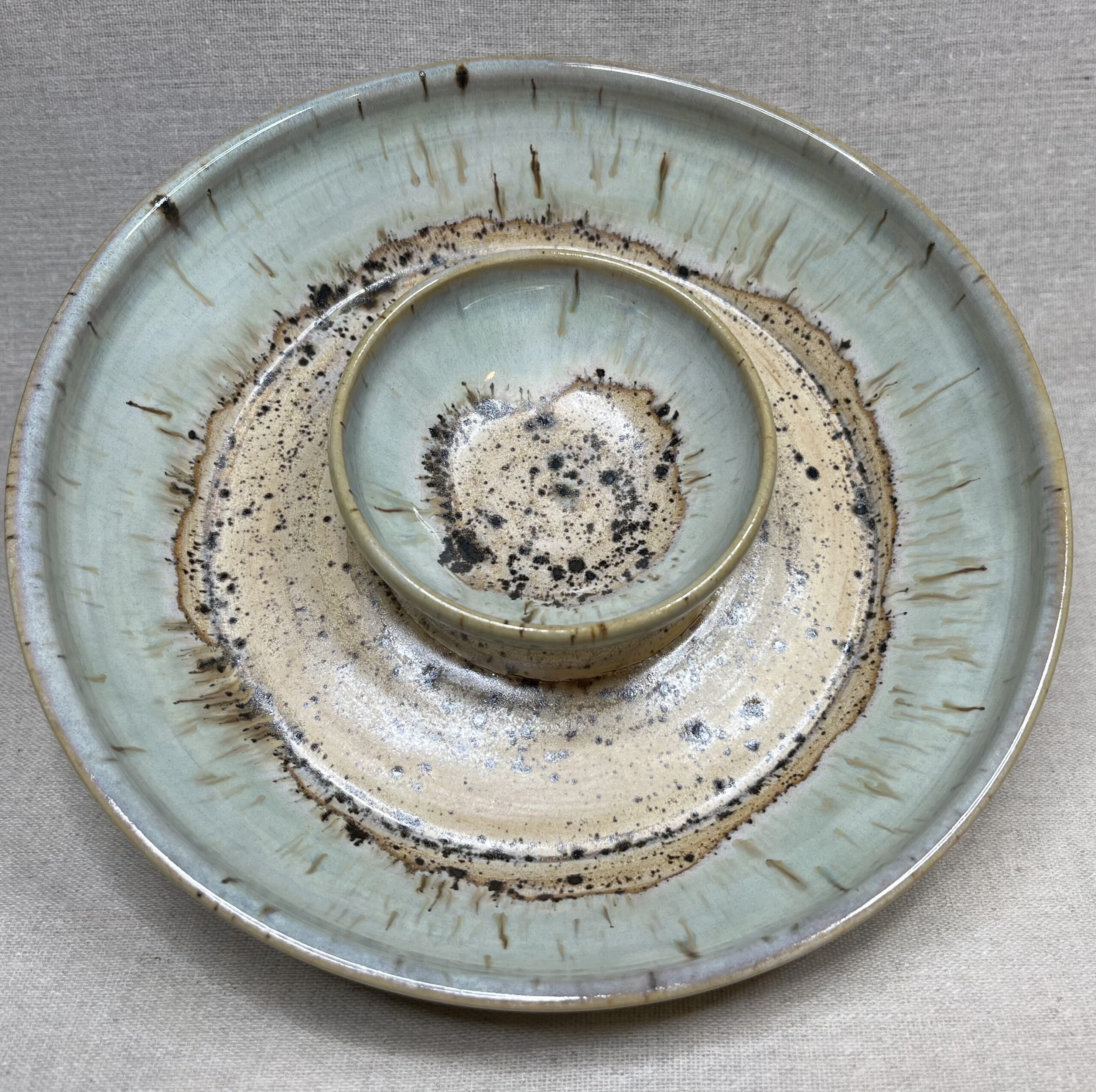Plateau de partage façonné à la main, aux teintes douces de vert pâle et de sable. Les coulures et les nuances se sont dessinées naturellement à la cuisson, rendant chaque pièce unique. Le creux central invite à partager sauces, olives ou petites bouchées. Un plateau pensé pour les tables vivantes, les repas simples et les moments qui durent.